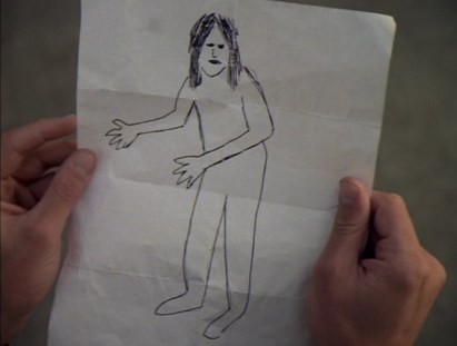 Back in A.C. and flying solo now, Mulder meets a homeless man who shows him a sketch (“stuck in a pocket of a jacket I found”) of the thing that’s been eating the homeless people. This is the infamous drawing that has engendered so much backlash among monster enthusiasts, and in fact it is kind of an amazing artifact to behold, a kind of lazily drawn sketch of a hominid, Jackson Browne hair, addressing the viewer in an attitude that is somewhere between Patterson-Gimlin and Walk Like an Egyptian.